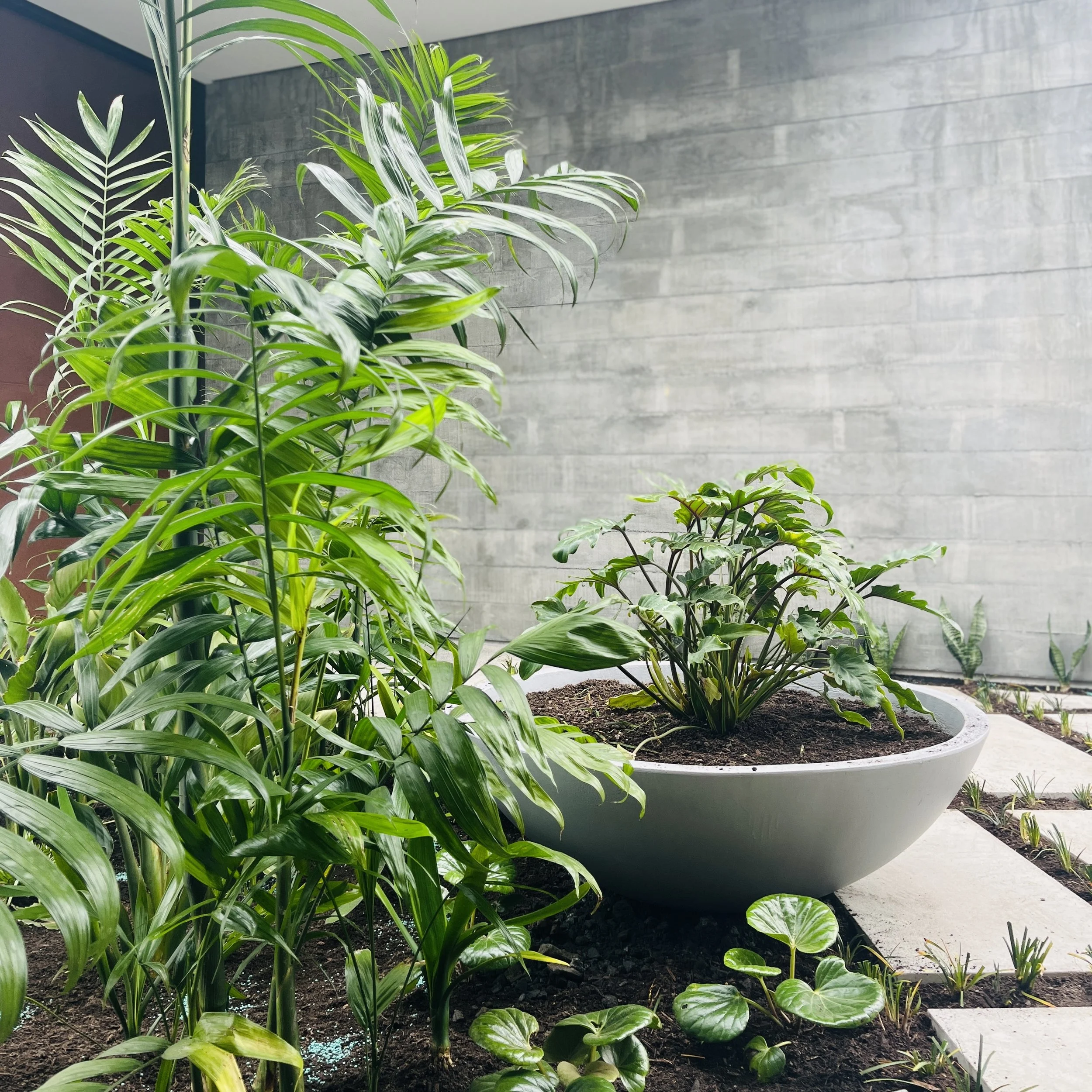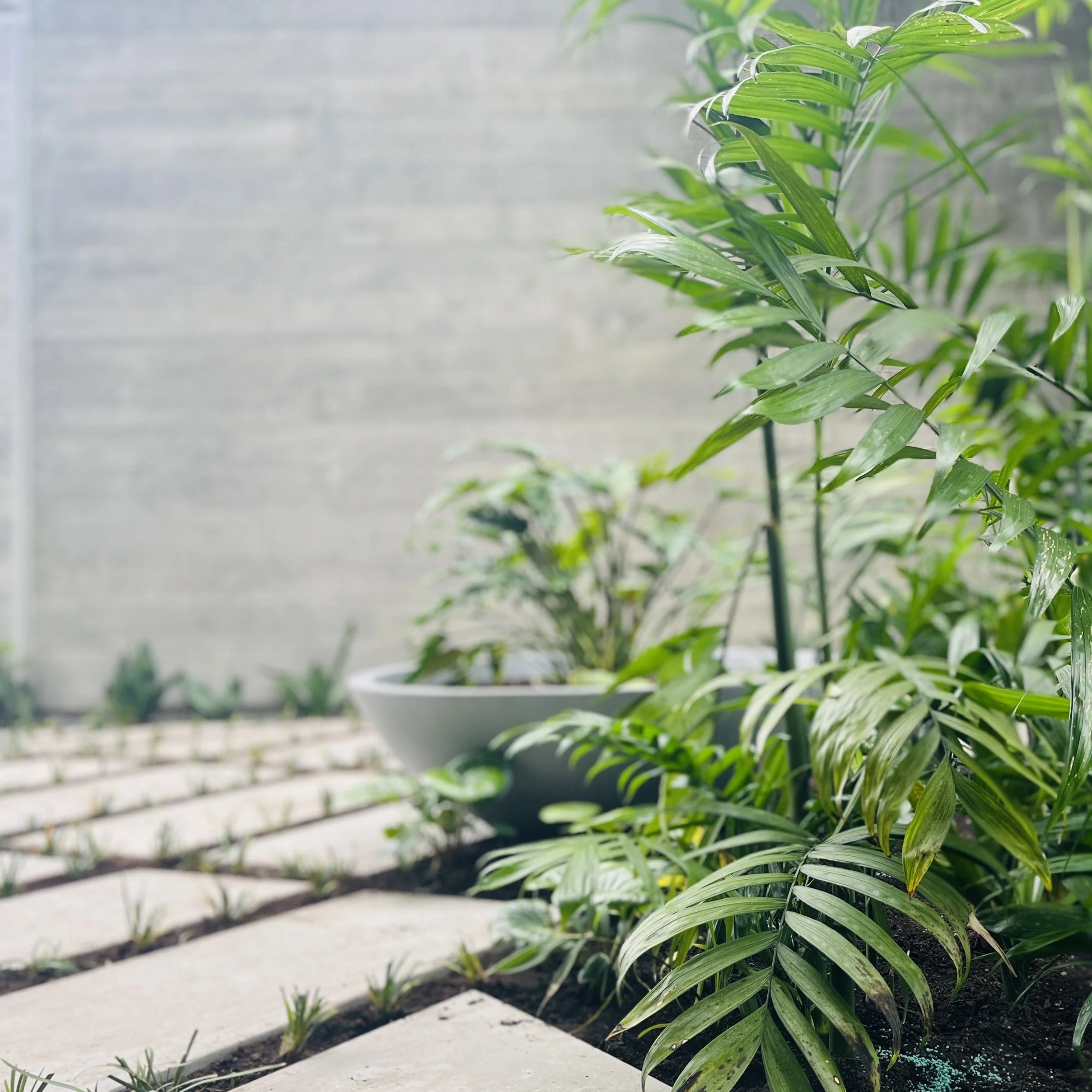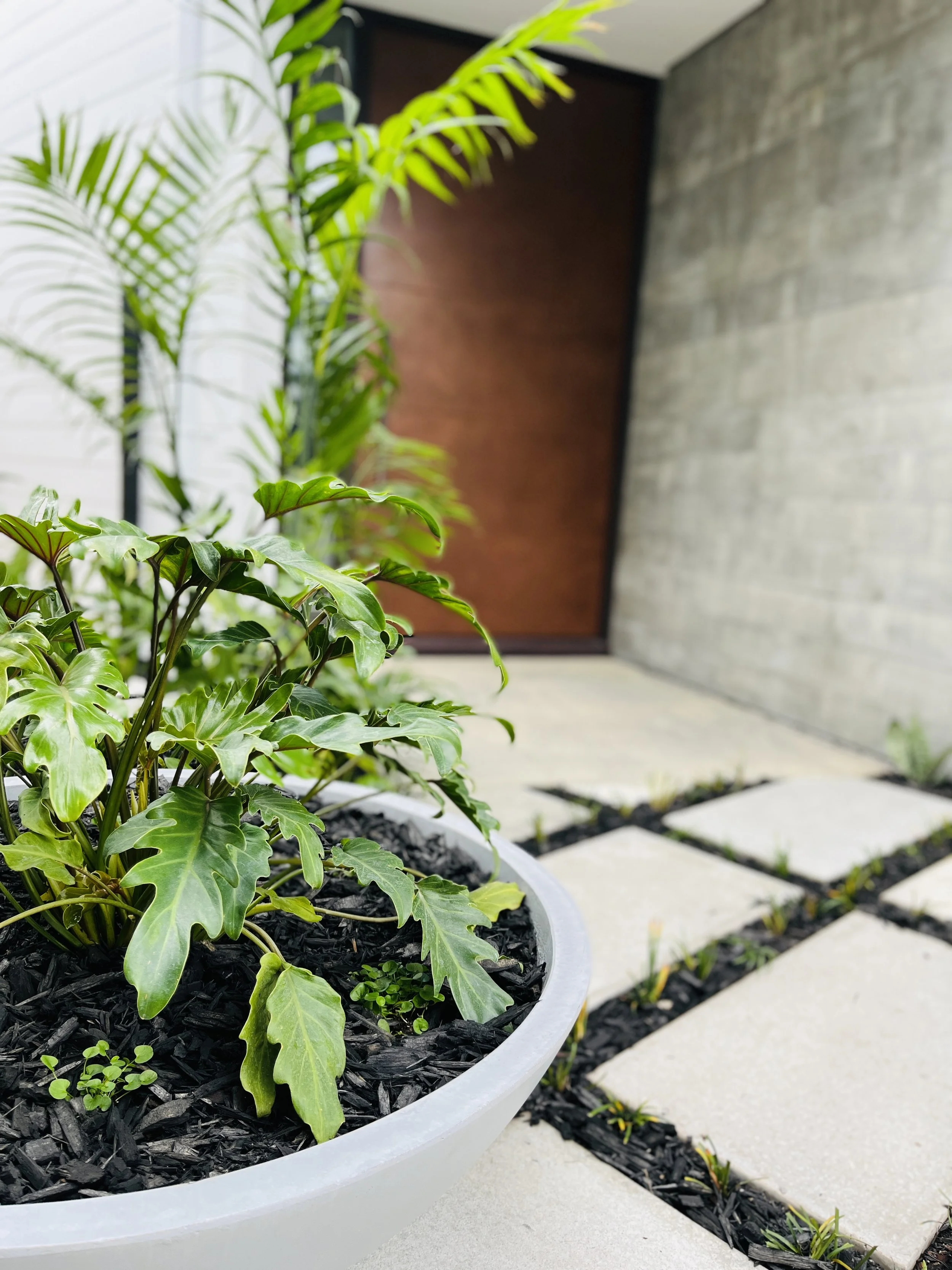 A planting palette with rich tropical greens, architectural foliage and blooms of whites & yellows were chosen & placed to suit the shaded location.